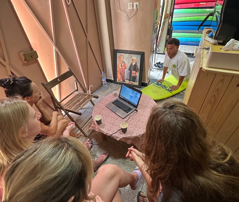 Chaque cours de surf et séance guidée est agrémenté d'une analyse vidéo amusante ! Nous filmons chacun sur les vagues, et après la séance, nous examinons les images ensemble. Vous recevrez des conseils personnalisés pour améliorer vos compétences en surf : c'est comme avoir votre propre film de surf, mais avec l'avantage de progresser à chaque vague ! 🌊🎬