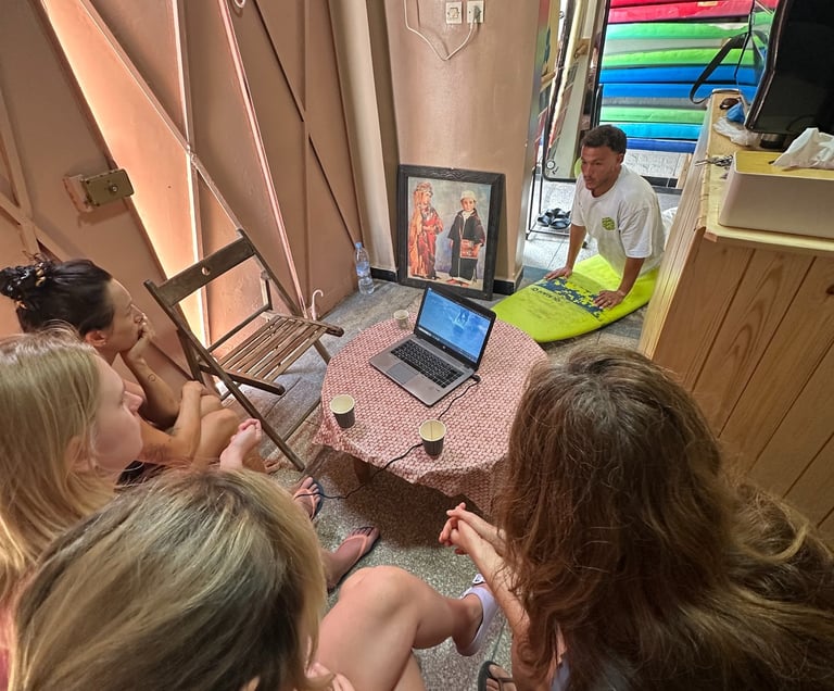 Cada clase de surf y sesión guiada incluye un toque divertido de videoanálisis. Filmamos a todos surfeando las olas y, después de la sesión, nos sentamos a revisar las grabaciones juntos. Recibirás consejos personalizados para mejorar tus habilidades de surf. Es como tener tu propia película de surf, ¡pero con la ventaja de mejorar con cada surf! 🌊🎬